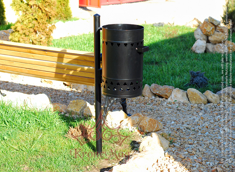 A szeméttároló tartálya acéllemezből készül és vastagsága 1 mm, valamint lóhere alakú dekoratív lyukak díszítik