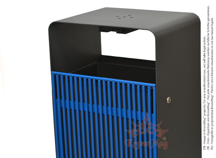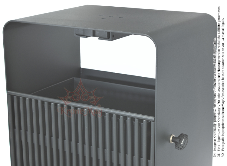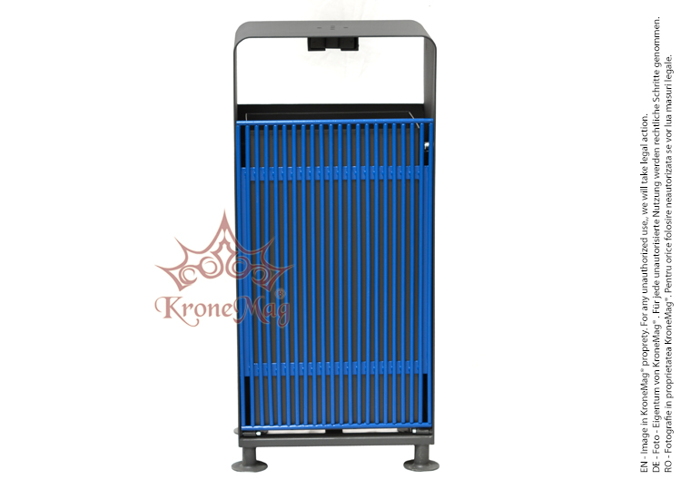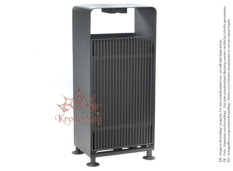 A födeles, csikktartós hulladékgyűjtő, kuka fémrúdas előlappal, ideális parkokba illetve bármely nyilvános helyre.